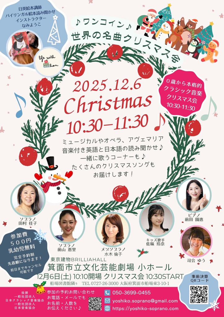 下記アドレス宛に「クリスマス会(お名前)」等の件名でメールをお送りください。こちらyoshiko.soprano●gmail.comをコピーして、●を@に変更いただいても問題ありません。送信後、翌日中に講師より返信がない場合、講師側でメール受信や発信がうまくできていない可能性があります。⇒⇒そのようなときは「メールが届いていないかもしれないので、念のため」との旨でお電話いただけますと幸いです。